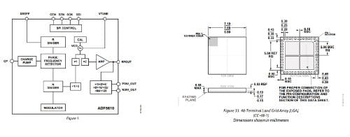 The ADF5610 is a microwave wideband synthesizer with an RF output frequency range of 57 MHz to 14.6 GHz, a fractional-N synthesizer and integer N synthesizer modes, 24-bit fractional modulus and an exact frequency mode for 0-Hz frequency error. With an integrated rms jitter of less than 40 fs, the ADF5610 has a typical PFD spurious of less than –105 dBc and a normalized inband phase-noise floor with high current mode having –232 dBc/Hz (integer) and –229 dBc/Hz (fractional), while normal mode has –229 dBc/Hz (integer) and –226 dBc/Hz (fractional). The ADF5610 also includes programmable divide output (1, 2, 4, 8, 16, 32, 64, 128), as well as a programmable output power level.