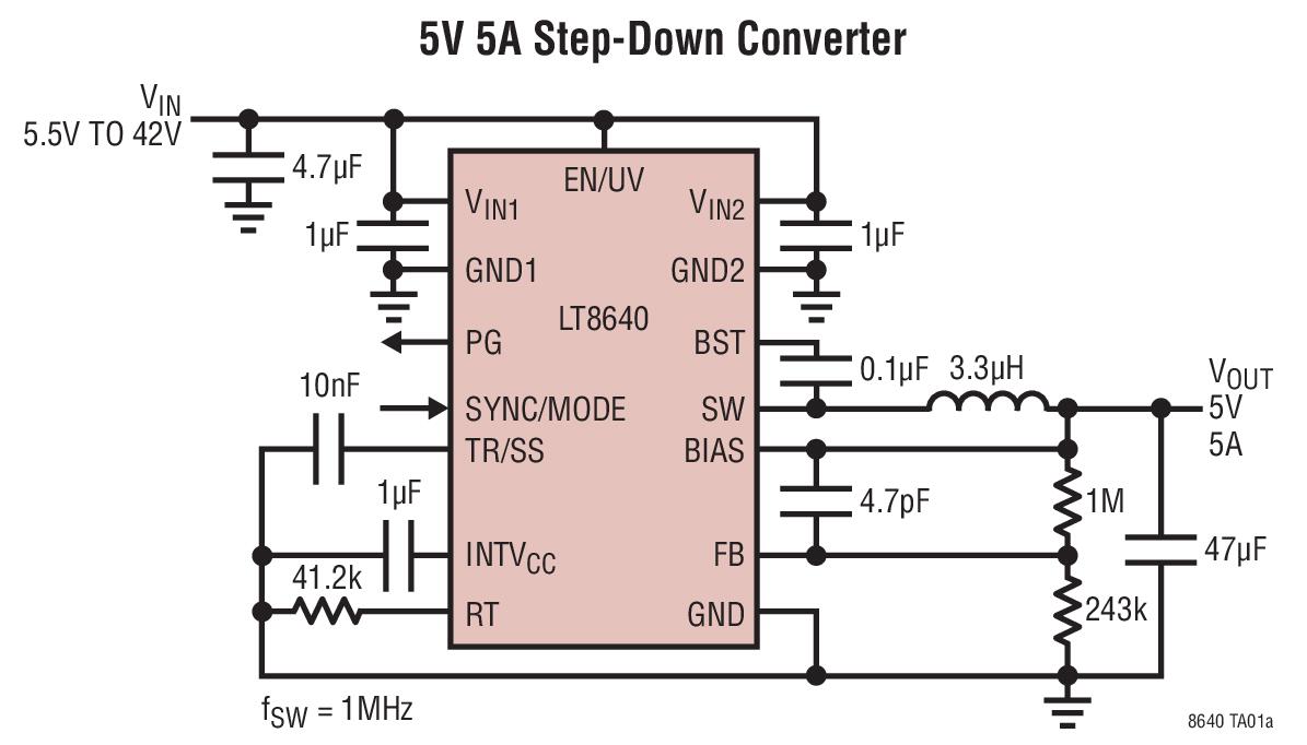 - Typical Application for LT8640 42V, 5A Synchronous Step-Down Silent Switcher with 2.5 uA Quiescent Current. The LT8640/LT8640-1 step-down regulator features Silent Switcher architecture designed to minimize EMI/EMC emissions while delivering high efficiency at frequencies up to 3MHz