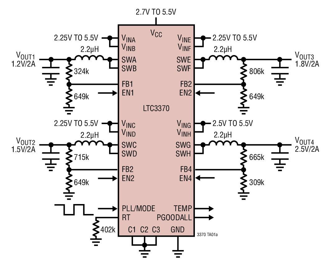 - Typical Application for LTC3370 - 4-Channel 8A Configurable Buck DC/DCs. The LTC3370 is a highly flexible multioutput power supply IC. The device includes four synchronous buck converters, configured to share eight 1A power stages, each of which is powered from independent 2.25V to 5.5V inputs