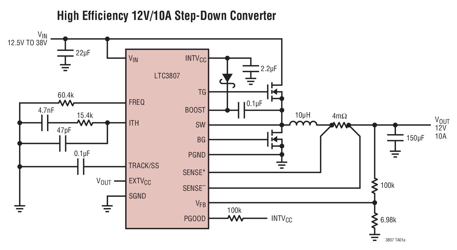 - Typical Application for LTC3807 - Low IQ, Synchronous Step-Down Controller with 24V Output Voltage Capability. The LTC3807 is a high performance step-down switching regulator DC/DC controller that drives an all N-channel synchronous power MOSFET stage