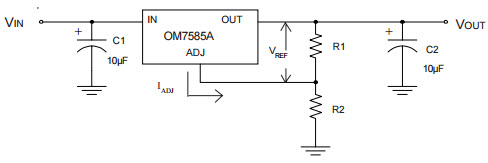 • Typical Application for OM7585AST Adjustable Positive Linear Regulator. The OM7585AST is an adjustable positive linear regulator with a 5A maximum current capability