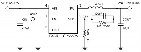 Typical Application for SP6669, 1.5-MHZ, 600mA SYNCHRONOUS STEP DOWN CONVERTER