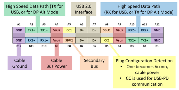 Abbildung 2 zeigt die USB-C Pinbelegung. Sie besteht aus fünf unterschiedlichen Bereichen: